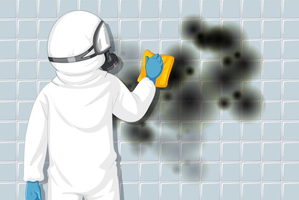 Man in protective hazmat suit cleaning mold on the wall illustration