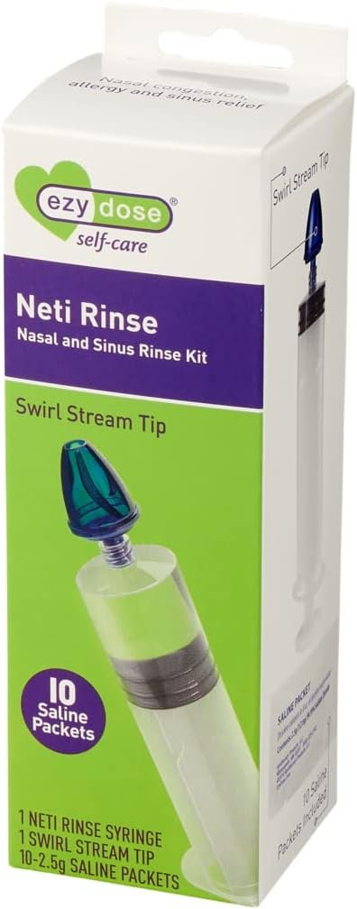 Relieve sinus pressure and congestion fast with the Ezy Dose Sinus and Allergy Relief Syringe. This BPA-free kit features a unique Swirl Stream Tip for a gentle rinse and includes 10 pure saline packets for effective care at home or while traveling.