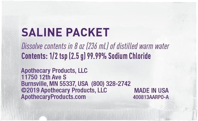 Pure Saline Packets: Includes 10 packets of 99.99% pure Sodium Chloride (2.5g each) for a safe and gentle rinse.