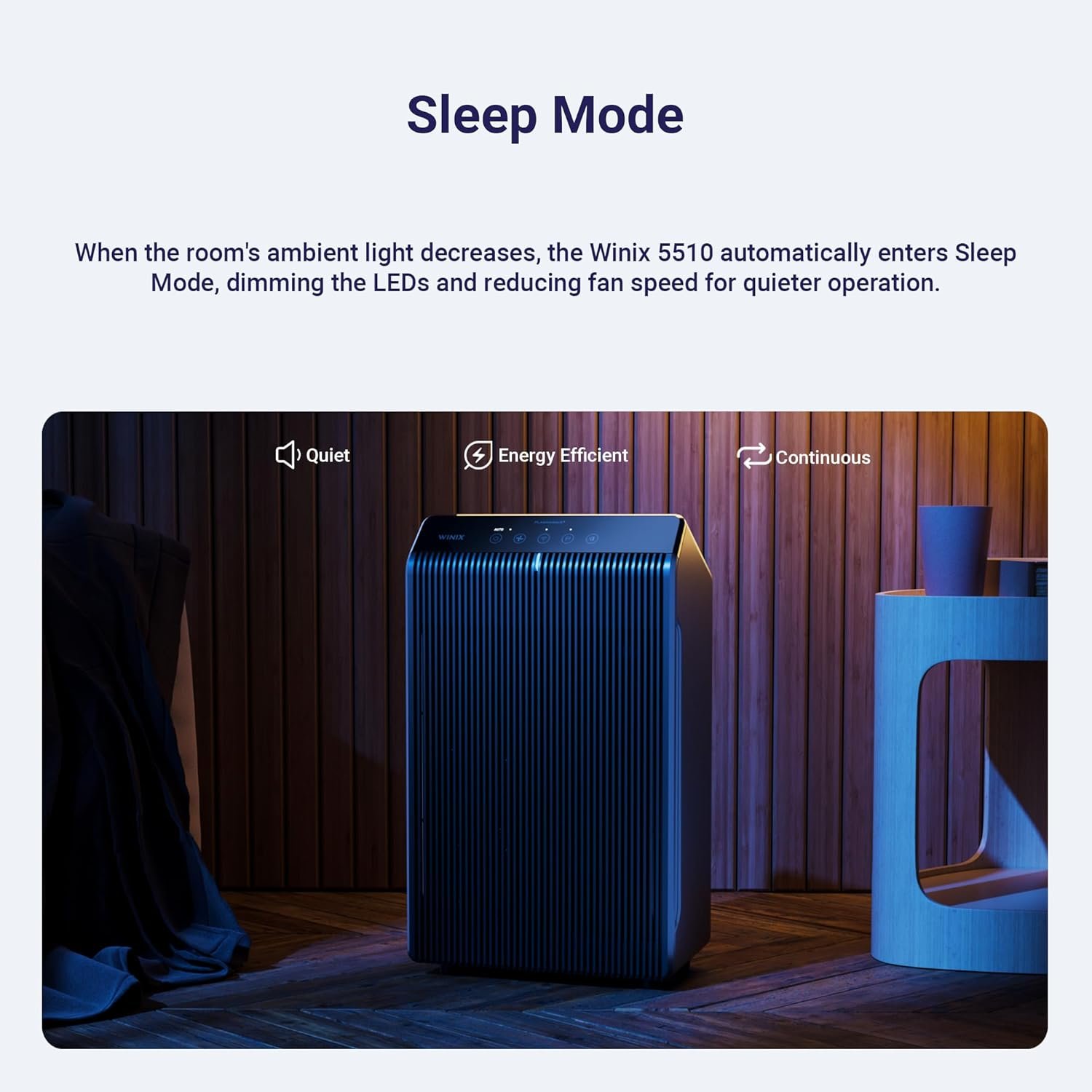 Light Sensor: The unit automatically detects when the room is dark and switches to Sleep Mode, dimming the lights and running the fan whisper-quiet for an undisturbed night’s rest.